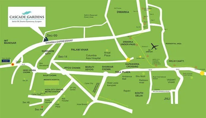 A heavenly city within a city, Cosmos Cascade Gardens enjoys a strategic location Sector 99, Property in Gurgaon Gurugram on Dwarka Expressway. The township offers proximity to IGI domestic and international terminals, Dwarka Metro Station, Connaught Place, Delhi Gurgaon Expressway and Gurgaon Faridabad Expressway. National Highway 8 connects the locality to other parts of the city, making it easily accessible and well connected. The preeminent Cyber City also lies in close vicinity of the area giving it an edge over other townships nestled in the area.