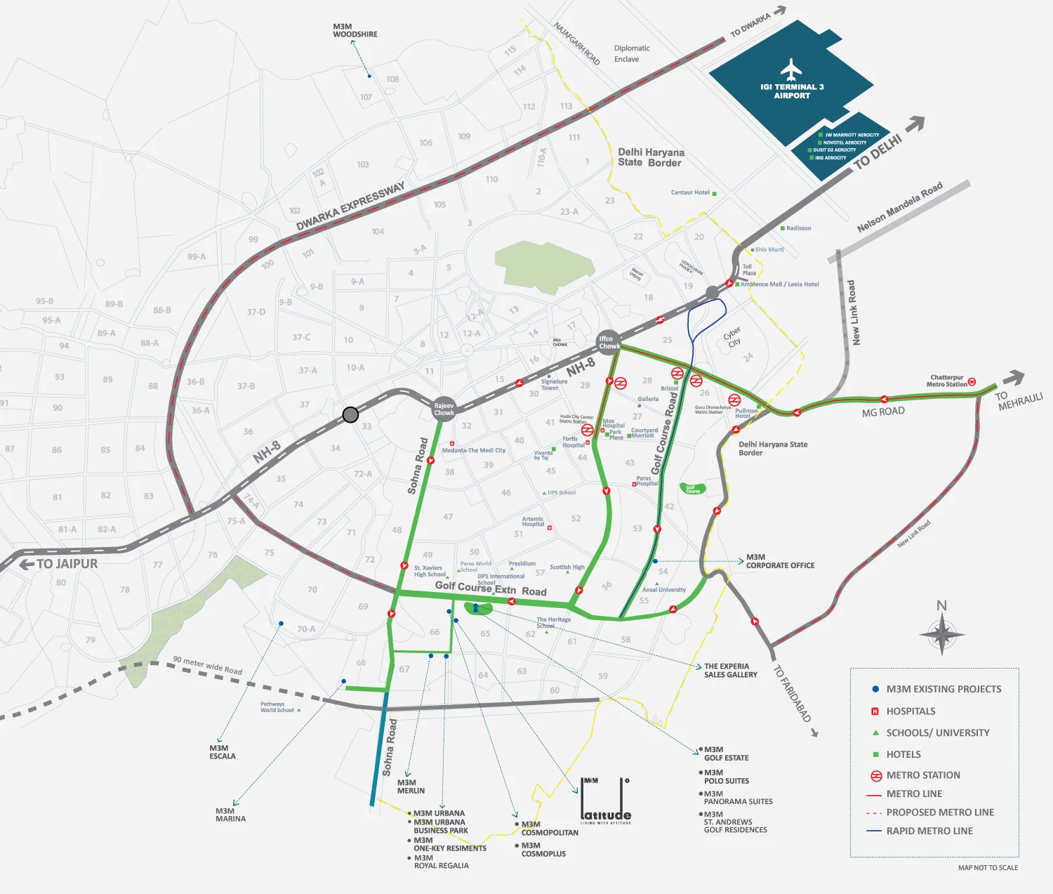 - Located on the Metro corridor, offering fast, convenient and comfortable connectivity to Delhi, easy accessibility to NH8 as well as to South Delhi via Gurgaon Faridabad expressway.
